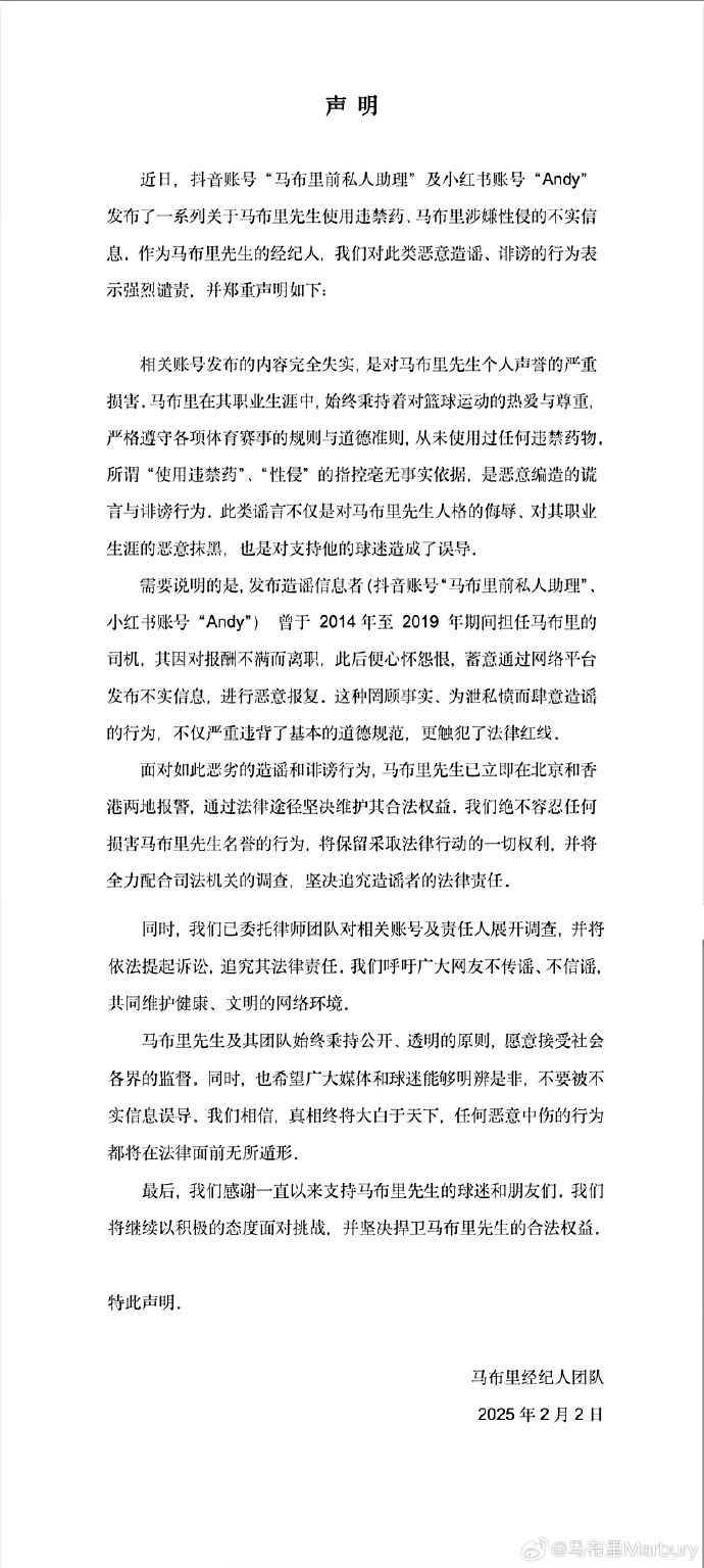 馬布里隨后通過個人微博發(fā)布了一篇其經(jīng)紀人團隊撰寫的澄清信,證實了馬布里已報警的說法,并對“Andy”進行了強烈譴責,原文如下: