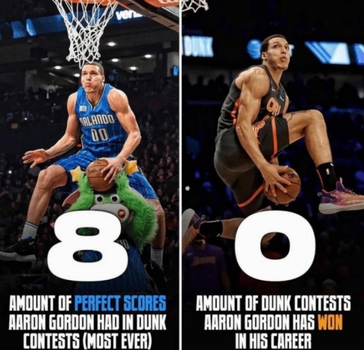 阿隆-戈登一共參加過(guò)三次扣籃大賽,他雖然8次拿到50分滿分,但一次扣籃王也沒(méi)拿到過(guò)。