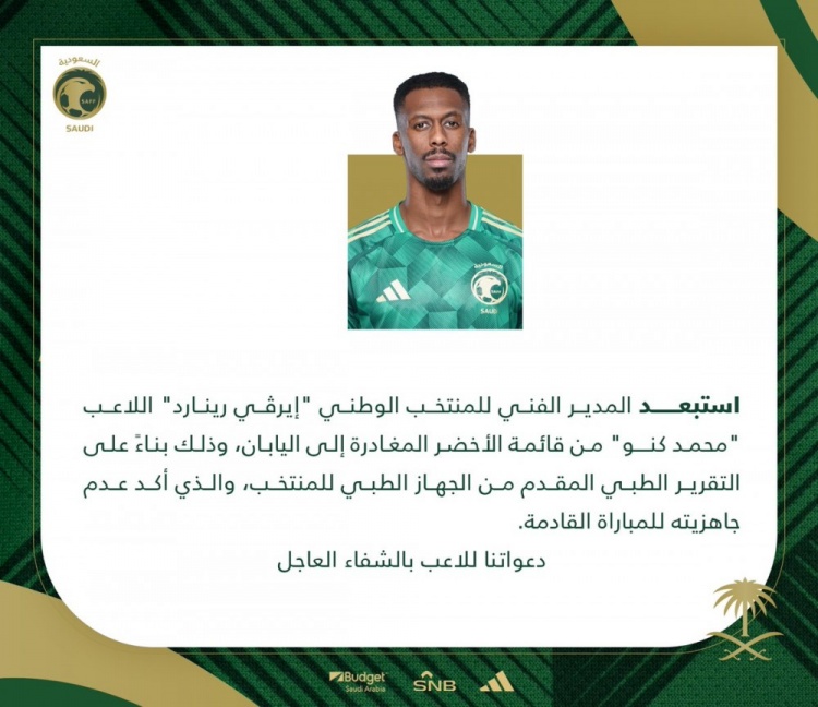 3月21日訊 沙特隊官方確認(rèn),穆罕默德-卡努因傷退出本期國家隊。