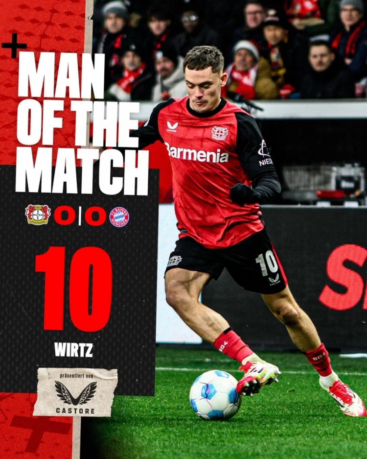2月17日訊 德甲第22輪焦點(diǎn)戰(zhàn),勒沃庫森主場0-0和拜仁握手言和。賽后,勒沃庫森官方宣布,維爾茨當(dāng)選本場比賽的隊內(nèi)最佳球員。