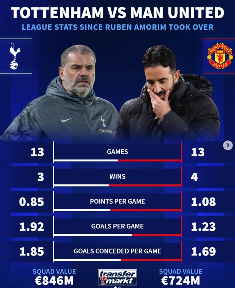 數(shù)據(jù)統(tǒng)計(jì)顯示,自阿莫林接手曼聯(lián)以來,紅魔英超近13輪僅4勝,場均1.08分、打進(jìn)1.23球、丟1.69球;而澳波同期帶領(lǐng)熱刺13輪僅3勝,場均0.85分、打進(jìn)1.92球、丟1.85球。