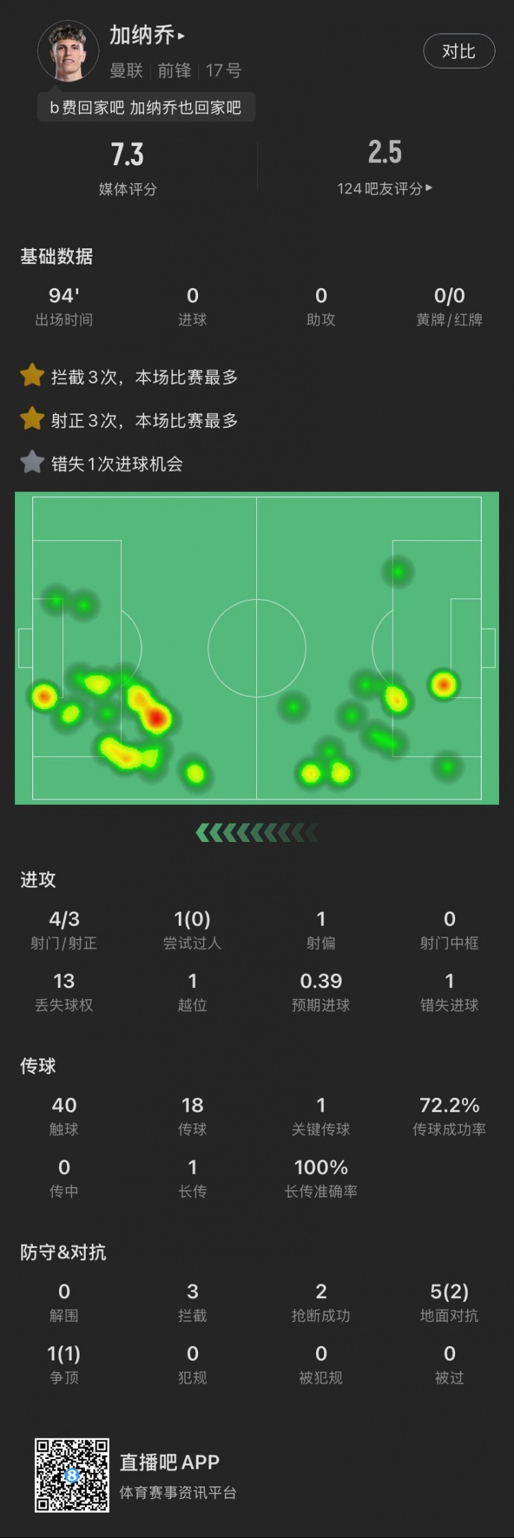 2月17日訊 在剛剛結(jié)束的英超本輪焦點(diǎn)戰(zhàn)中,曼聯(lián)0-1不敵熱刺。本場比賽,加納喬打滿全場但表現(xiàn)欠佳,獲評7.3分。