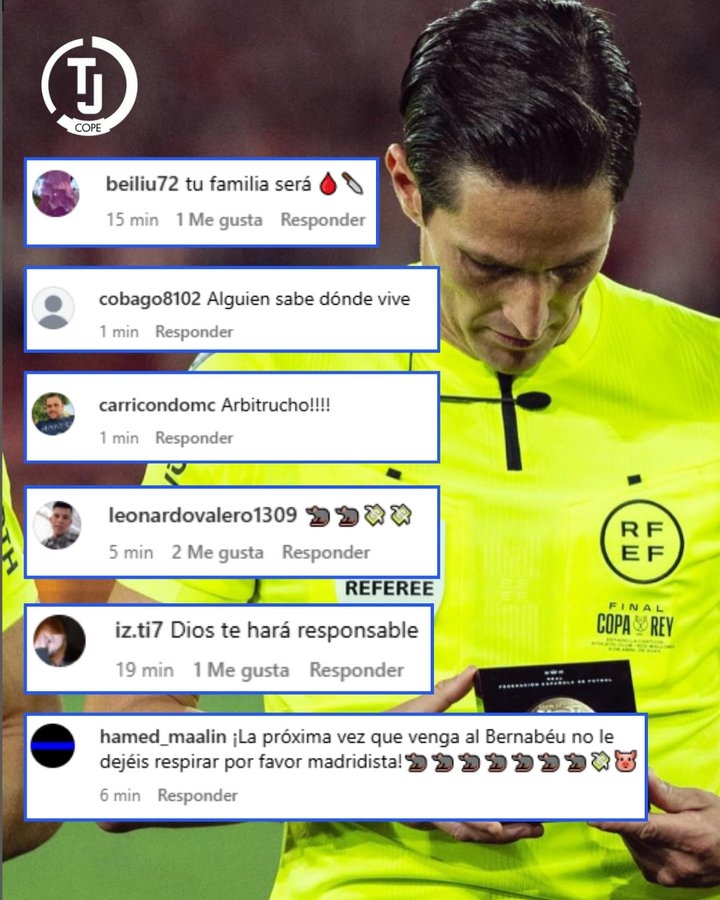 穆努埃拉因上周六在埃爾薩達爾球場頗具爭議的判罰,已成為皇馬球迷的眾矢之敵。其最新帖文下涌現近10萬條評論,充斥著針對其本人及家屬的各類辱罵與威脅。