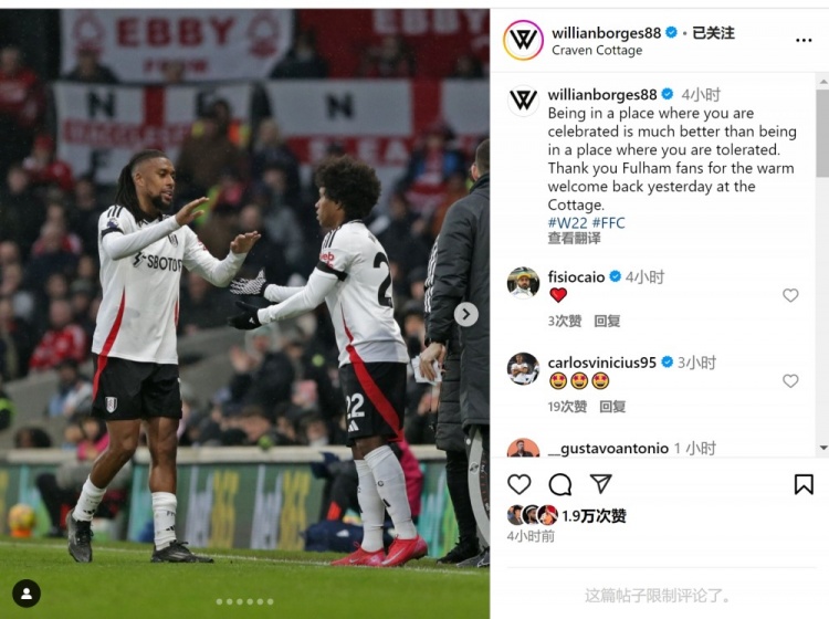 威廉在社交媒體上曬出自己替補(bǔ)出場的照片,配文:“在一個(gè)受人贊美的地方,比在一個(gè)被人容忍的地方要好得多。感謝富勒姆球迷昨天在克拉文農(nóng)場球場對我的熱情歡迎。”
