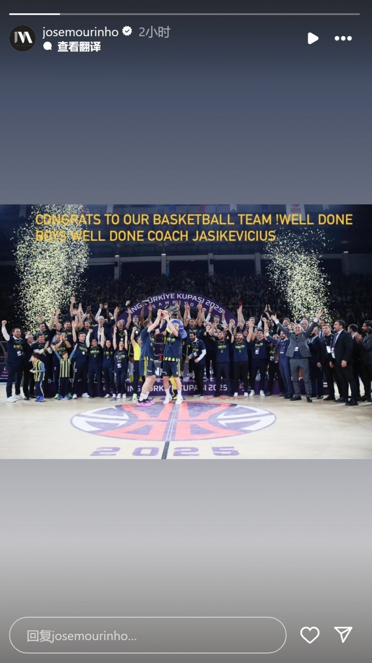穆里尼奧更新社媒動(dòng)態(tài),曬出費(fèi)內(nèi)巴切籃球隊(duì)捧杯的照片,并配文:“祝賀我們的籃球隊(duì)!做得好小伙子們,做得好主帥雅西科維丘斯!”