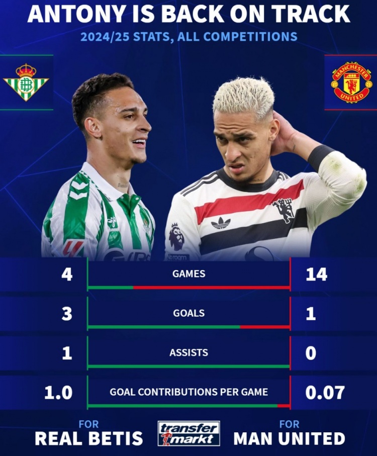 數(shù)據(jù)統(tǒng)計(jì)顯示,安東尼在冬窗加盟貝蒂斯后4場貢獻(xiàn)3球1助攻,場均直接參與1球。