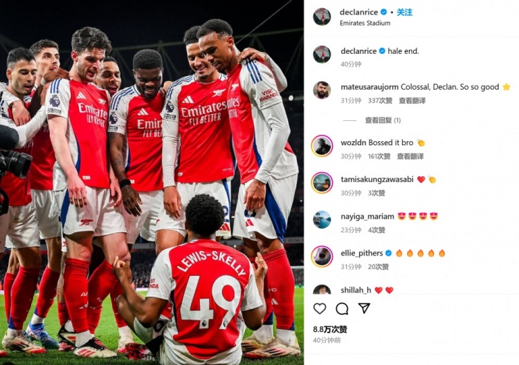 賴斯也在賽后通過社媒曬出自己和隊友們圍觀小將斯凱利打坐慶祝的照片,并配文:“黑爾恩德。”
