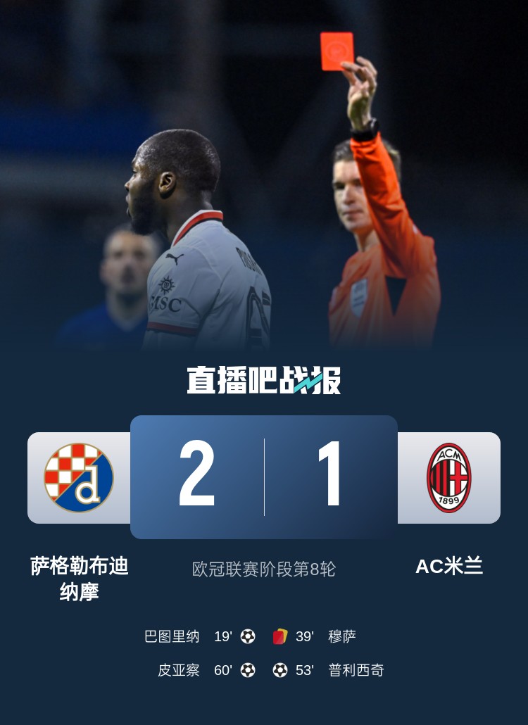 歐冠聯(lián)賽階段最后一輪,米蘭也是因為紅牌葬送好局勢。米蘭原本取勝可直接晉級16強(qiáng),但穆薩上半場就兩黃被罰下,米蘭最終1-2不敵薩格勒布迪納摩,無緣前八。