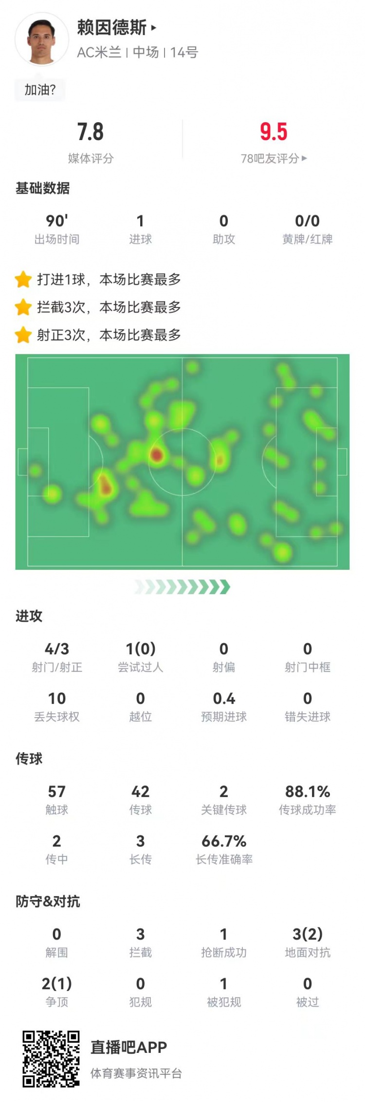 2月3日訊 米蘭在本輪意甲1-1戰(zhàn)平國米,賴因德斯本場數(shù)據(jù)如下:
