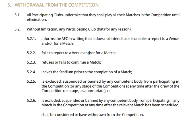 根據(jù)公告中提到的亞足聯(lián)競(jìng)賽規(guī)則5.2,以下行為應(yīng)被視為退出亞冠精英聯(lián)賽: