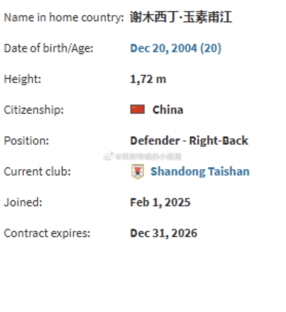 德轉(zhuǎn)頁面顯示,此前因年齡造假被禁賽三個(gè)月的球員謝木西丁·玉素甫江就是原中國(guó)U20國(guó)青隊(duì)員,山東泰山的玉蘇甫???? 標(biāo)簽: 足球 中超 中國(guó)足球 山東泰山 轉(zhuǎn)載