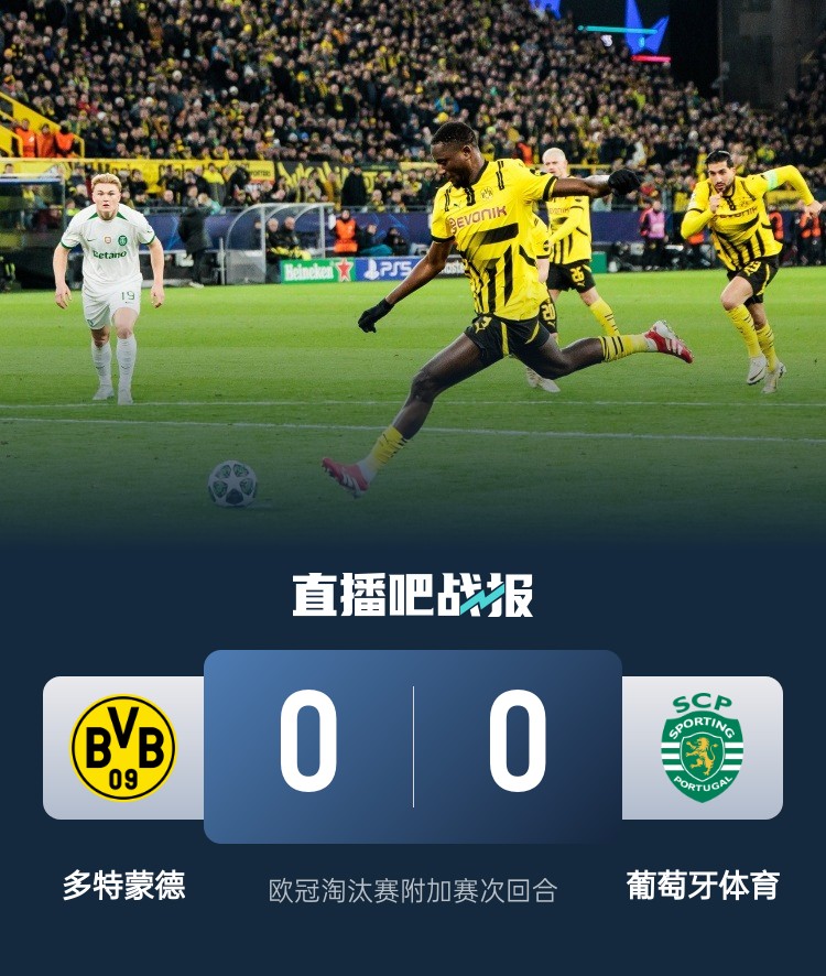 歐冠淘汰賽附加賽次回合,多特0-0葡萄牙體育,總比分3-0晉級16強。上半場,多特占據(jù)場上主動多次威脅球門,可惜未能把握住進(jìn)球機會;下半場,阿德耶米造點,吉拉西主罰點球被撲,雷納單刀中柱,埃姆雷-詹進(jìn)球被吹。
