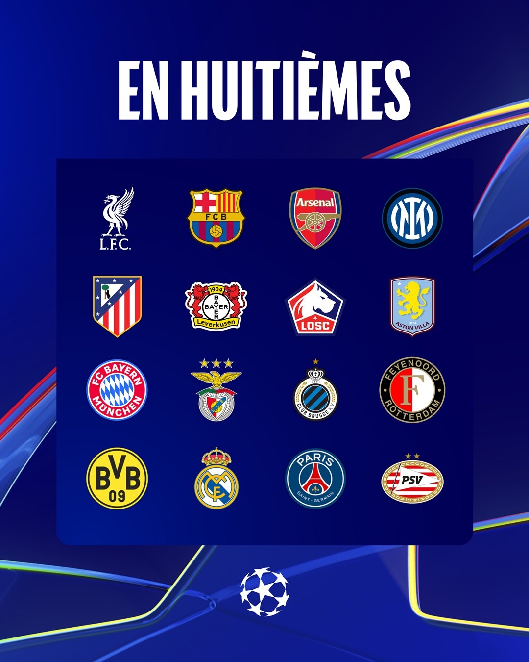 附加賽晉級8隊:本菲卡、拜仁慕尼黑、費(fèi)耶諾德、布魯日、多特蒙德、巴黎圣日耳曼、皇家馬德里、埃因霍溫