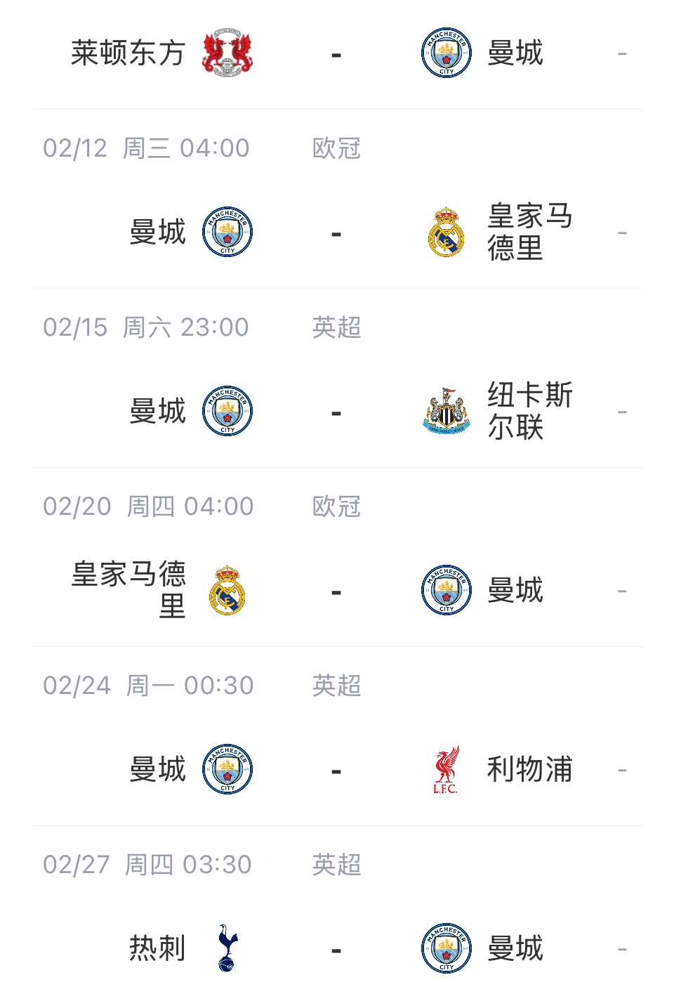 下一場(chǎng)客戰(zhàn)萊頓東方之后,曼城需要先主后客對(duì)陣皇馬,在英超賽場(chǎng)還需要對(duì)陣紐卡、利物浦、熱刺。