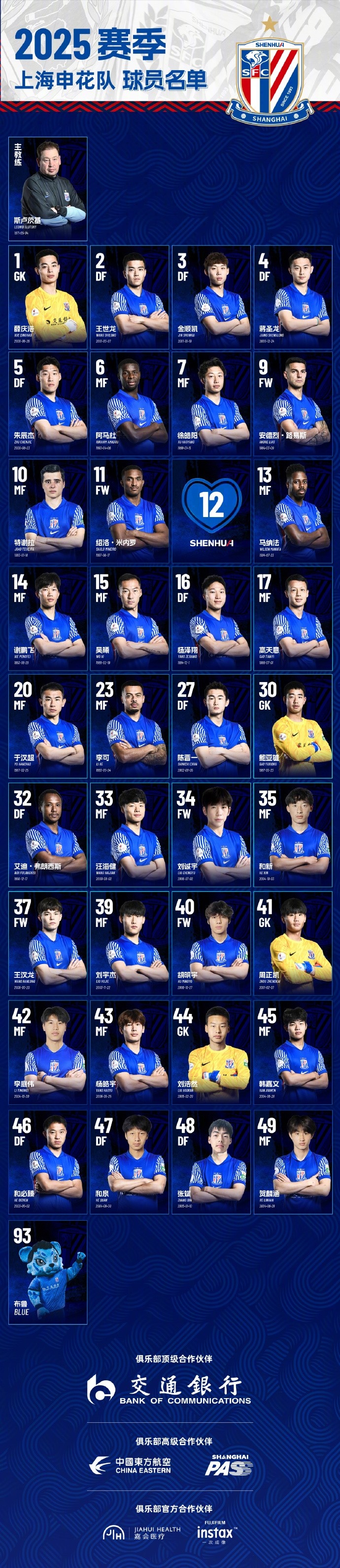 2月20日訊 上海申花官方公布了2025賽季一線隊球員名單,阿馬杜、路易斯、特謝拉、米內(nèi)羅、馬納法5名外援領(lǐng)銜,吳曦、朱辰杰、于漢超、李可、劉誠宇等球員在列,共35名球員入選。