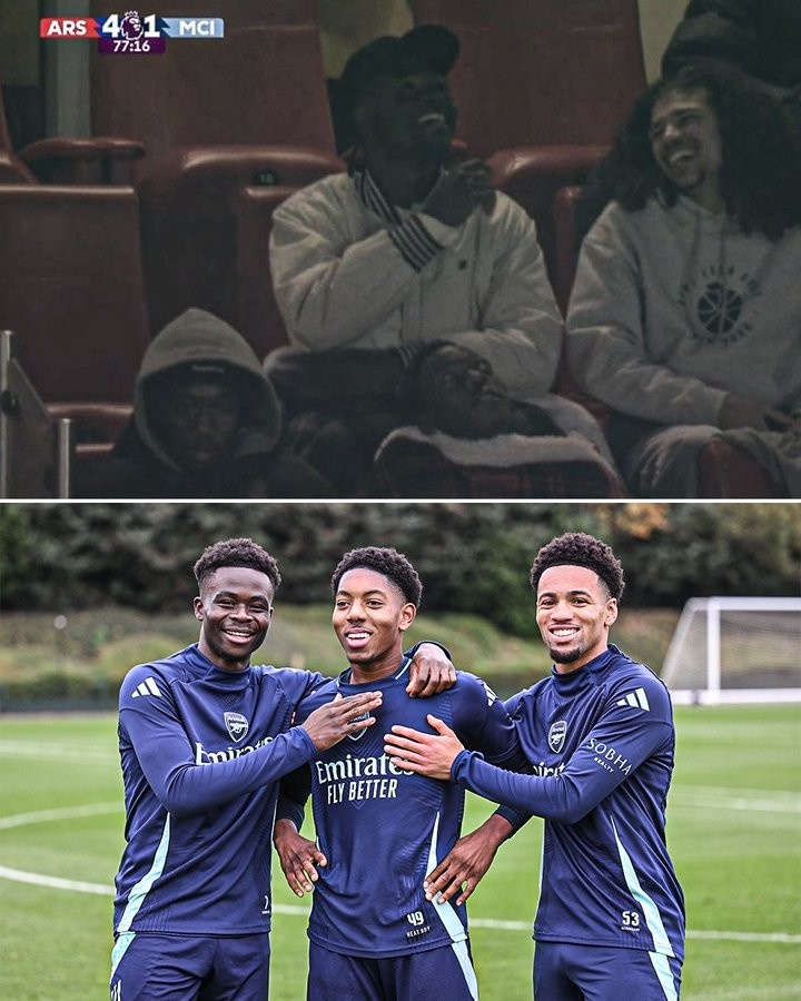 而比賽期間,攝像機也拍到了看臺上23歲的薩卡笑得“老懷大慰”的場景。
