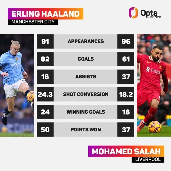 2月21日訊 OPTA統(tǒng)計(jì)了薩拉赫和哈蘭德過去三個(gè)賽季的進(jìn)球數(shù)據(jù),兩人都在英超參與了98個(gè)進(jìn)球,分別為曼城和利物浦贏得50分和37分。