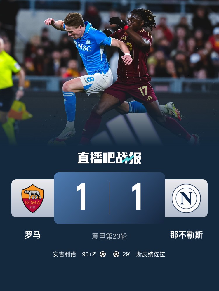 意甲第23輪,羅馬1-1那不勒斯。上半場,斯皮納佐拉挑射建功;下半場,傷停補(bǔ)時階段安吉利諾凌空絕平。