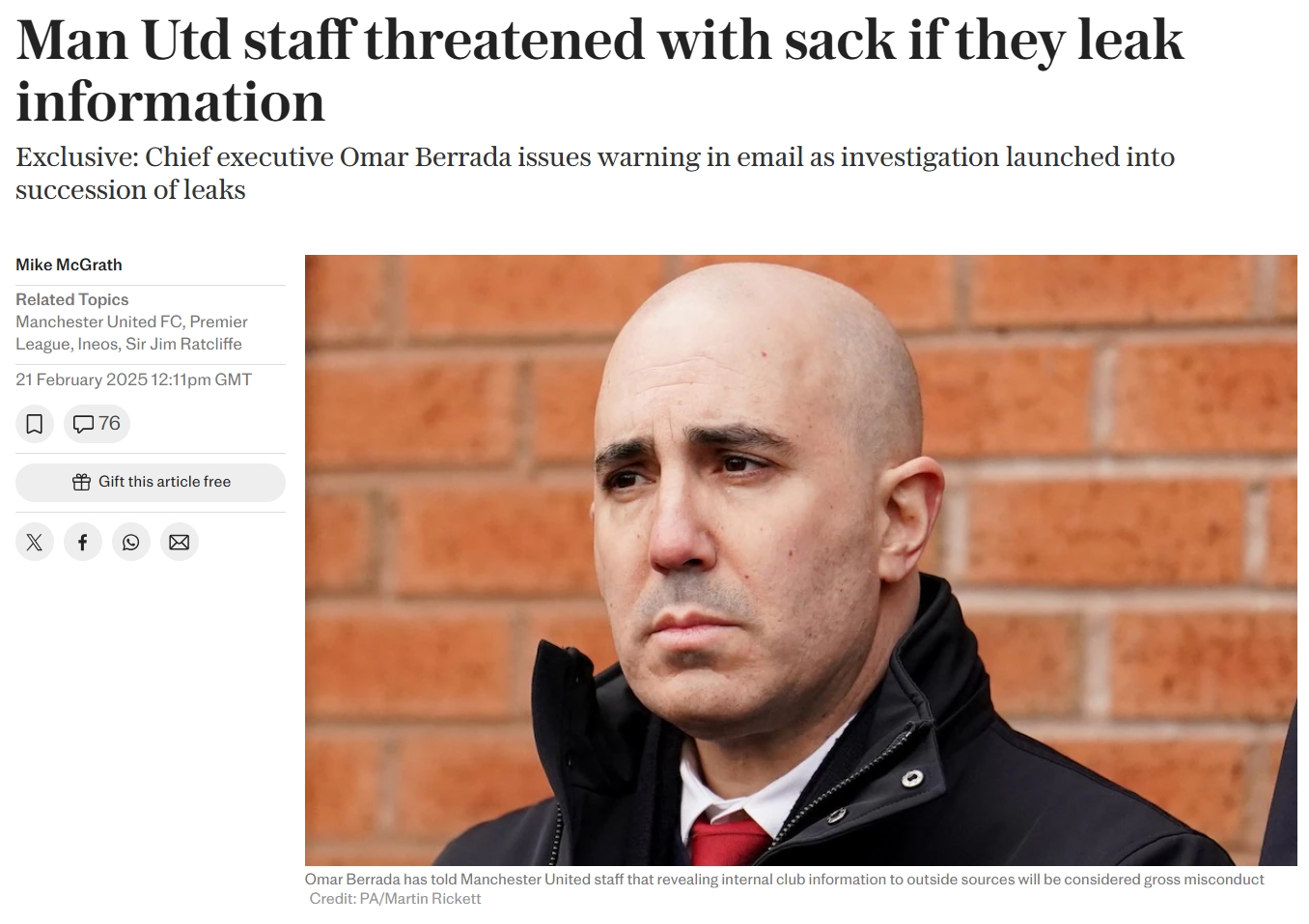 曼聯(lián)此前深受隊(duì)內(nèi)首發(fā)信息被提前泄露的困擾。在本周早些時候,貝拉達(dá)向曼聯(lián)員工發(fā)送了一封580字的郵件,工作人員被告知俱樂部目前正在采取額外措施防止這一現(xiàn)象發(fā)生。