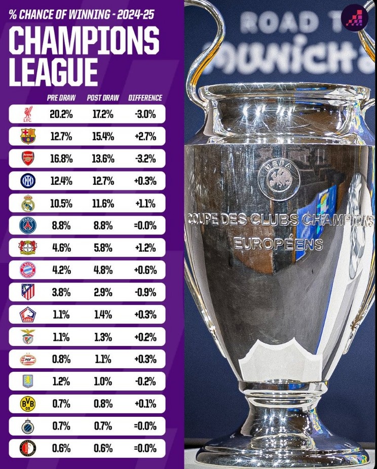 歐冠抽簽后奪冠概率變化:阿森納&利物浦下跌最多,巴薩漲幅最大