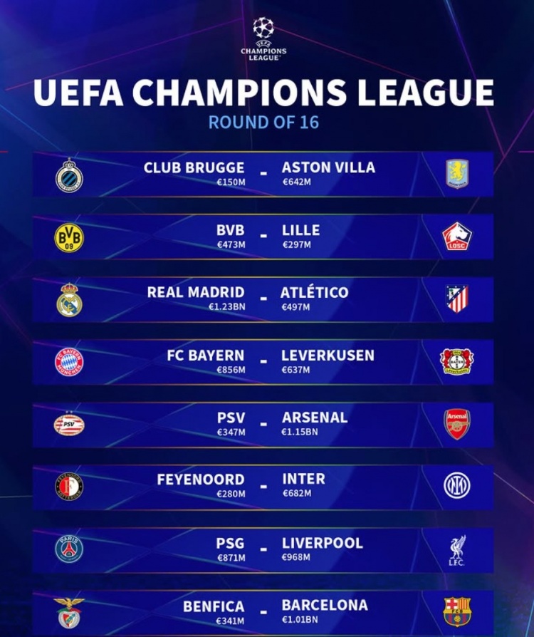 2月21日訊 歐冠十六強(qiáng)對陣已經(jīng)出爐,《轉(zhuǎn)會市場》也列出了各隊(duì)身價(jià)情況。
