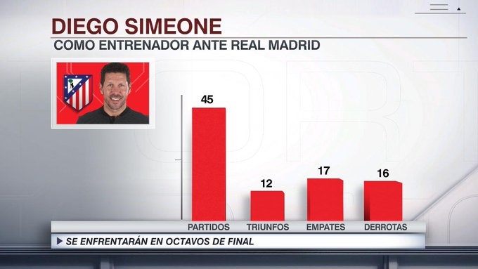ESPN統(tǒng)計了西蒙尼作為馬競主帥對陣皇馬的數(shù)據(jù),統(tǒng)計表明,西蒙尼至今一共45次帶馬競與皇馬比賽,戰(zhàn)績12勝17平16負(fù)。