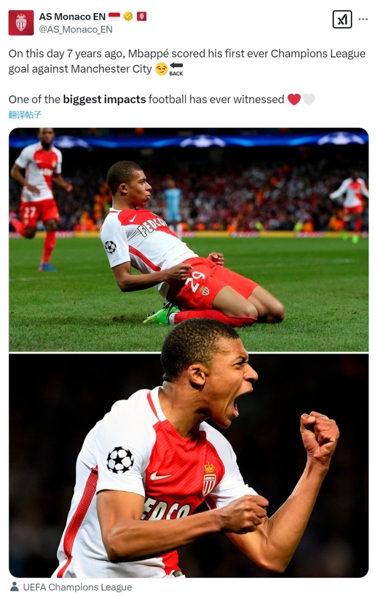 2017年2月21日,姆巴佩在摩納哥對陣曼城的歐冠1/8決賽首回合比賽中破門,攻入個人職業(yè)生涯歐冠首球。