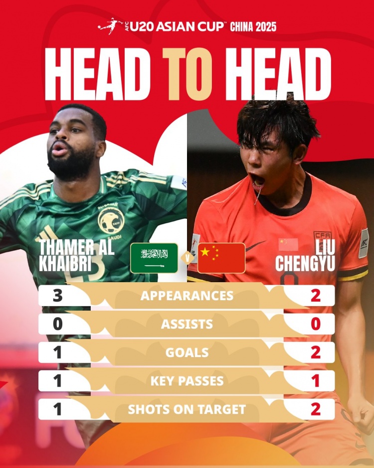 亞足聯(lián)官推今日曬出海報(bào)對(duì)本場(chǎng)比賽進(jìn)行預(yù)熱,出鏡的是國(guó)青前鋒劉誠(chéng)宇和沙特U20前鋒海布里,其中劉誠(chéng)宇在2場(chǎng)比賽2次射正斬獲2個(gè)進(jìn)球,1次關(guān)鍵傳球,海布里在3場(chǎng)比賽1次射正打進(jìn)1球,還有1次關(guān)鍵傳球。