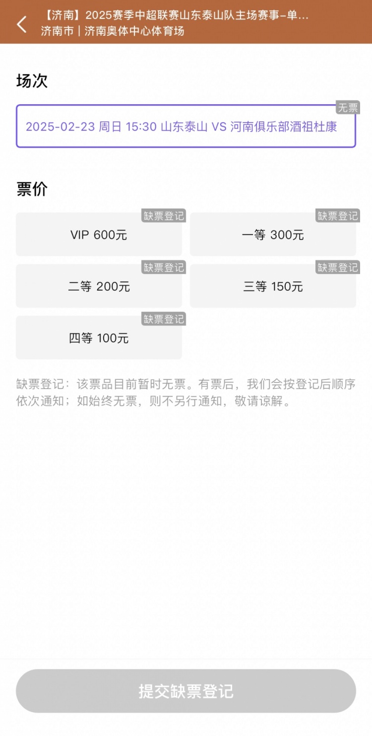 2月22日訊 2月23日下午,中超聯(lián)賽首輪山東泰山將在主場(chǎng)對(duì)陣河南隊(duì)。據(jù)購票平臺(tái)顯示,本場(chǎng)比賽球票已售罄。