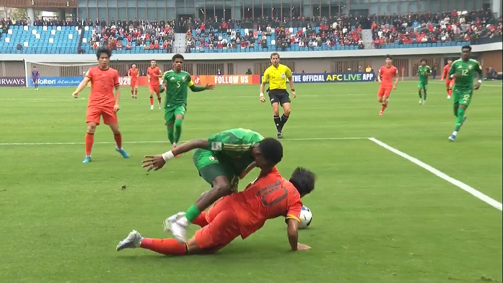 02月22日訊U20亞洲杯1/4決賽,中國(guó)vs沙特,比賽第17分鐘,蒯紀(jì)聞禁區(qū)內(nèi)護(hù)球,被沙特球員身后“摁倒”,裁判示意沒犯規(guī)。 標(biāo)簽: 足球 中超 中國(guó)足球 國(guó)家隊(duì)