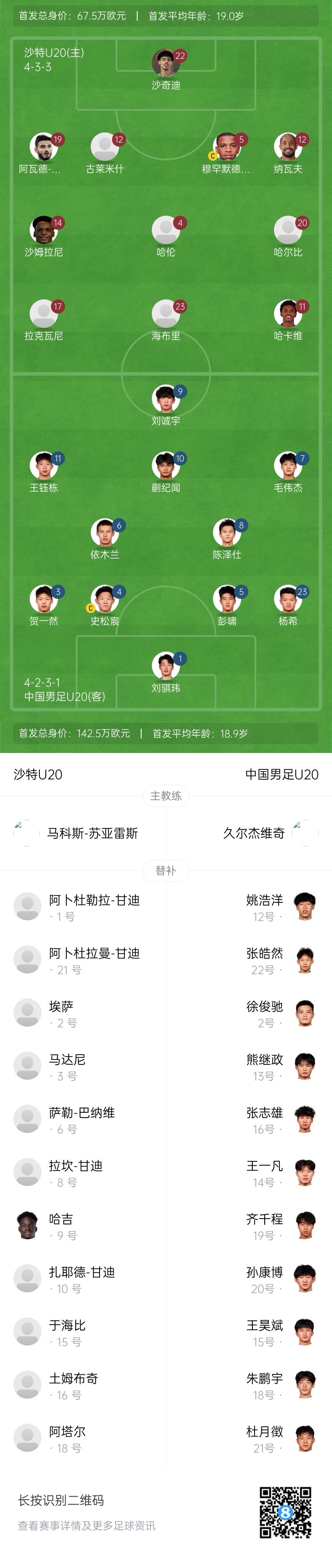 沙特U20替補:1-阿卜杜拉-甘迪、2-蘇丹-伊薩、3-圖爾基-邁達尼、6-薩利赫-巴爾納維、7-阿里-邁赫達維、8-拉坎-甘迪、9-塔拉勒-哈吉、10-齊亞德-甘迪、15-阿馬爾-尤海比、16-沙特-通卜蒂、18-拉米茲-阿塔爾、21-阿卜杜勒拉赫曼-甘迪