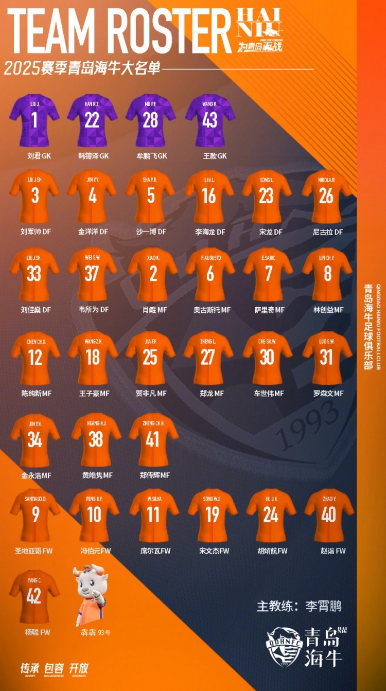 2025賽季青島海牛一線隊(duì)大名單,新賽季一起為青島而戰(zhàn)!