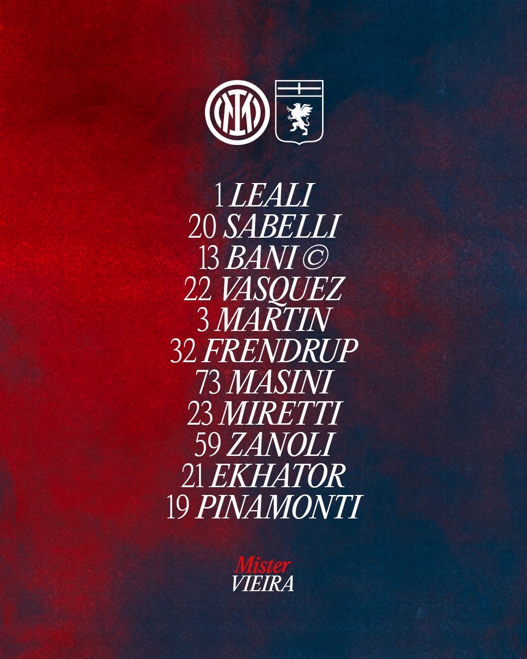 熱那亞首發(fā):1-尼科拉-萊亞利、20-薩貝利、13-巴尼、22-J-巴斯克斯、3-阿隆-馬丁、32-弗倫德盧普、73-馬斯尼、23-米雷蒂、59-薩諾里、21-??ㄍ小?9-皮納蒙蒂