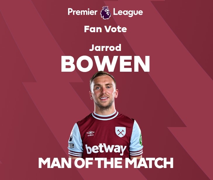 本場(chǎng)比賽西漢姆球員鮑文打進(jìn)唯一進(jìn)球,賽后他也當(dāng)選英超官方球迷票選全場(chǎng)最佳球員。