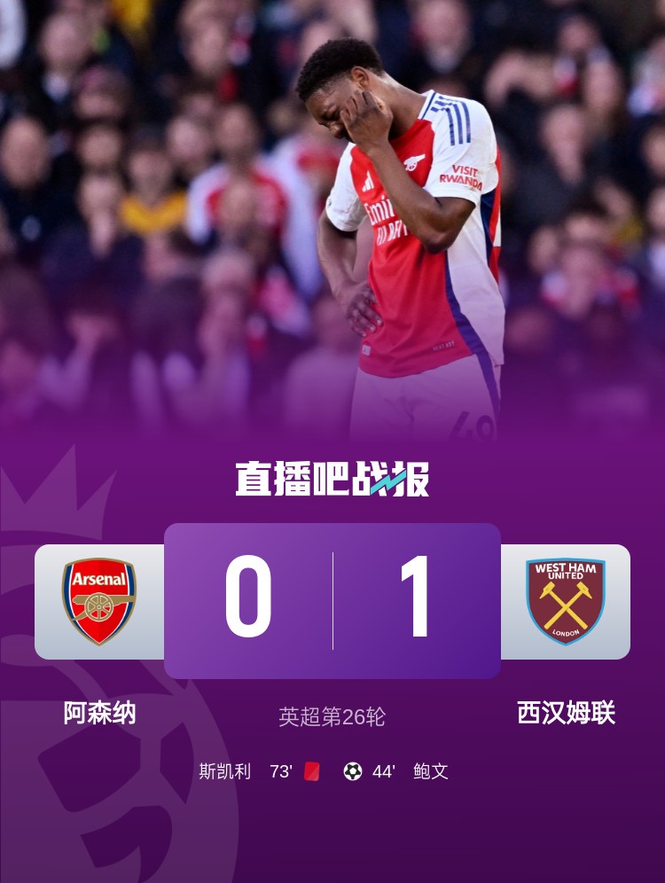 02月23日訊 英超第26輪,阿森納主場(chǎng)0-1不敵西漢姆,錯(cuò)失追分機(jī)會(huì)。
