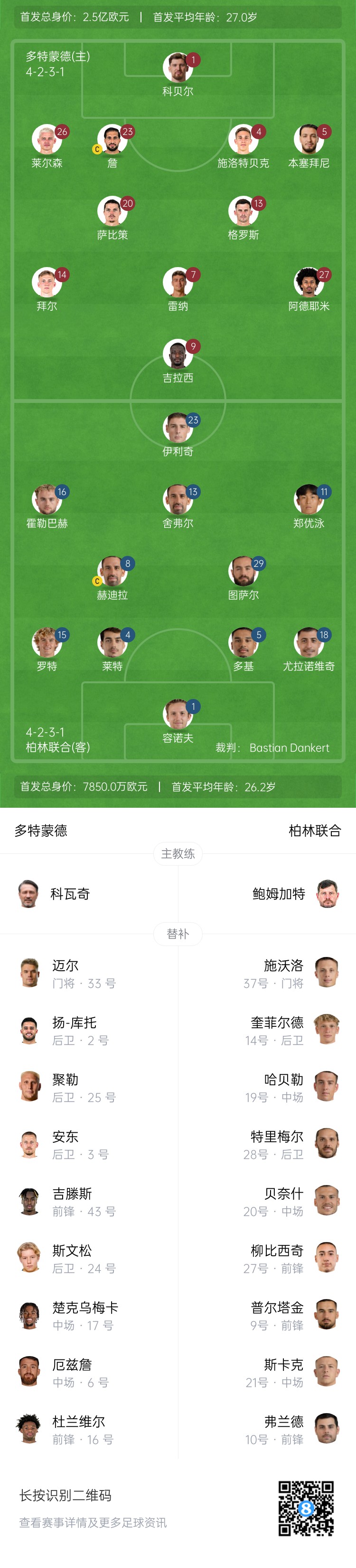 多特vs柏林聯(lián)合首發(fā):吉拉西、阿德耶米先發(fā),科貝爾、薩比策出戰(zhàn)