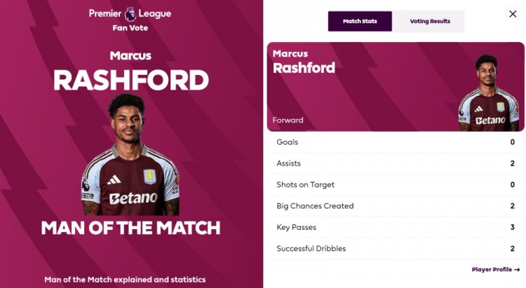 拉什福德的得票率為53.8%。本場(chǎng)比賽,拉什福德貢獻(xiàn)2次助攻,是維拉取勝的首功之臣。