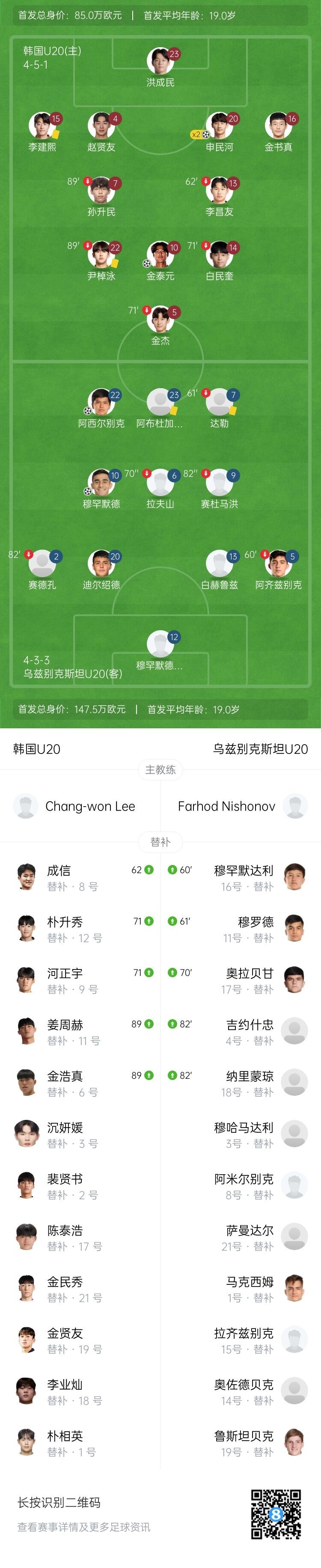2月23日訊 北京時(shí)間2月23日晚上19:30,U20亞洲杯1/4決賽,韓國(guó)U20對(duì)陣烏茲別克斯坦U20。上半場(chǎng),洪成民送點(diǎn)又撲點(diǎn),阿西爾別克破門(mén),申民河撿漏扳平。下半場(chǎng),申民河頭球梅開(kāi)二度,金泰元勺子進(jìn)球,穆罕默德扳回一球,阿布杜加富爾94分鐘絕平。90分鐘戰(zhàn)罷,雙方打成3-3進(jìn)加時(shí)賽!