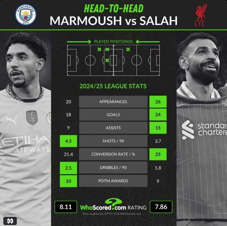 2月23日訊 本輪英超將迎來曼城與利物浦的焦點(diǎn)對(duì)話,也是兩位埃及前鋒薩拉赫、馬爾穆什首次在英超交鋒,數(shù)據(jù)網(wǎng)站W(wǎng)hoscored對(duì)比了本賽季兩人在聯(lián)賽中的數(shù)據(jù),具體如下: