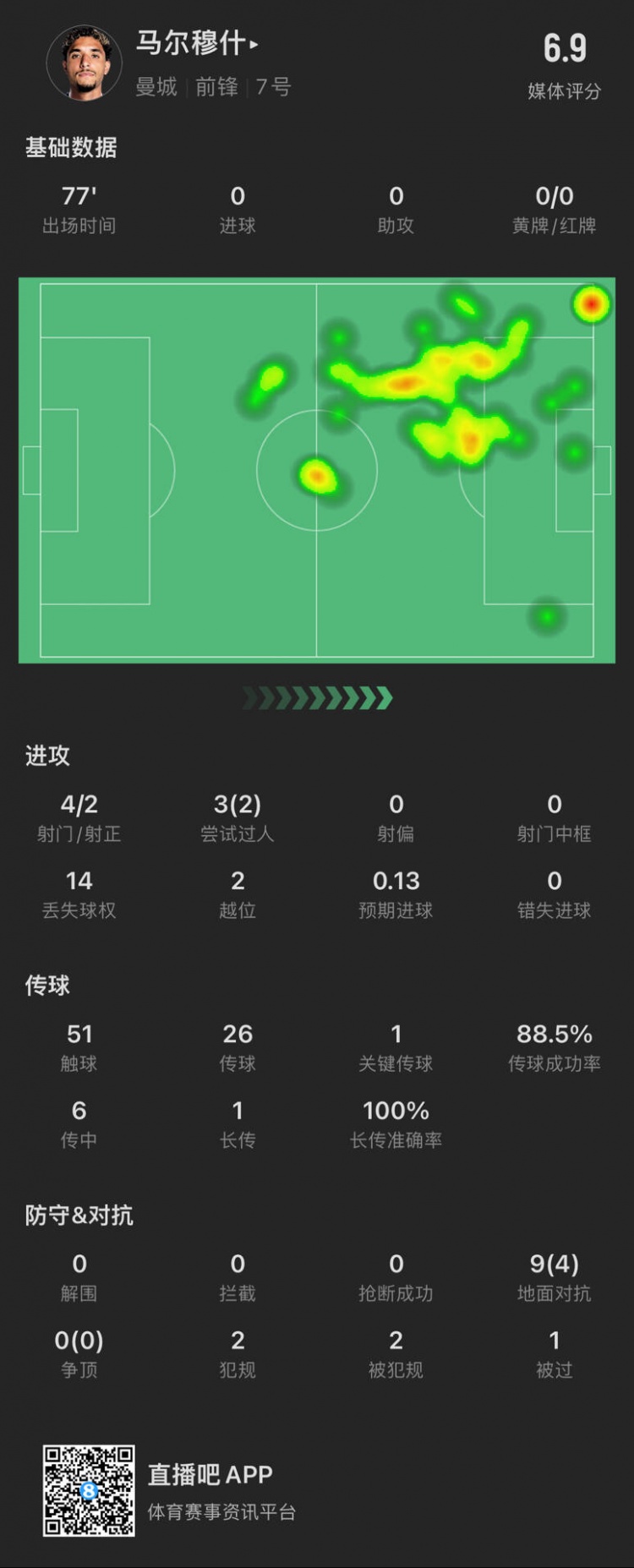 2月24日訊 英超聯(lián)賽第26輪,曼城主場(chǎng)對(duì)陣?yán)锲值谋荣愓谶M(jìn)行中,本場(chǎng)比賽曼城前鋒馬爾穆什首發(fā)登場(chǎng),第77分鐘被換下,以下是他本場(chǎng)比賽的數(shù)據(jù)。