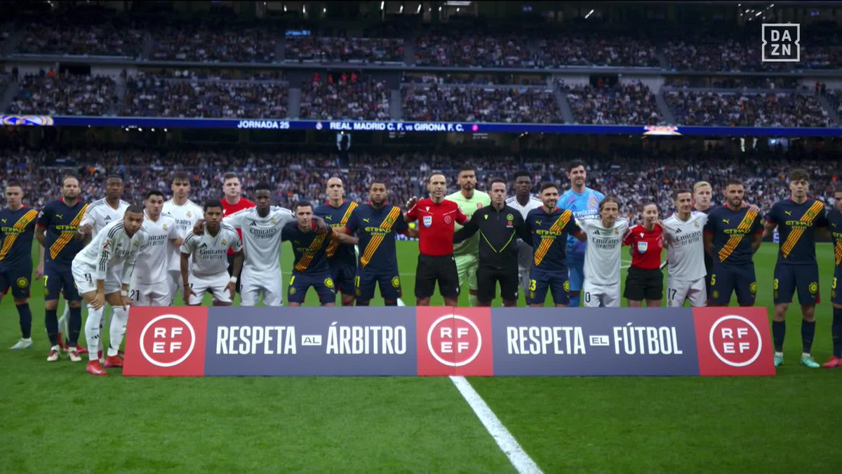 皇馬、赫羅納在“尊重裁判、尊重足球”標(biāo)語前合影,球迷爆發(fā)噓聲
