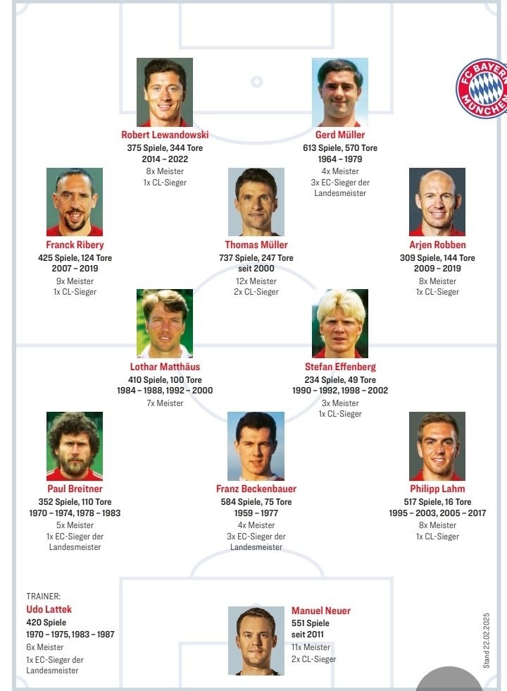 2月24日訊 拜仁迎來俱樂部成立125周年紀(jì)念,《踢球者》也評出了一套拜仁歷史最佳陣容。