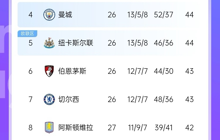 目前,英超第4曼城到英超第8維拉只有2分的分差。