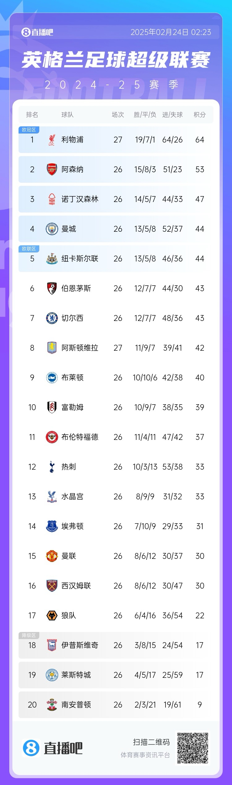 02月24日訊 本輪英超,利物浦2-0雙殺曼城。積分榜上,利物浦已賽27場64分領跑,阿森納已賽26場53分第二,森林26場47分第三,曼城26場44分第四。