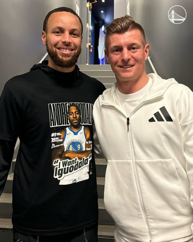 克羅斯現(xiàn)場(chǎng)看勇士vs獨(dú)行俠&伊戈達(dá)拉球衣退役儀式,賽后合影庫(kù)里