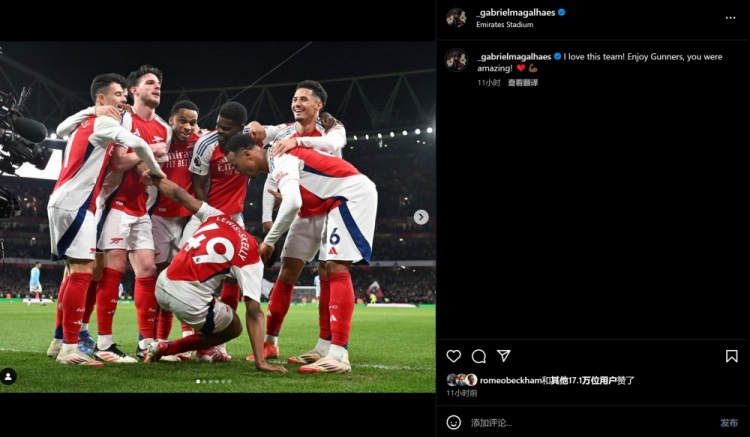 加布曬出全隊(duì)一起慶祝斯凱利進(jìn)球的照片,并寫道:我愛這支球隊(duì),槍手們好好享受吧,你們非常了不起!?