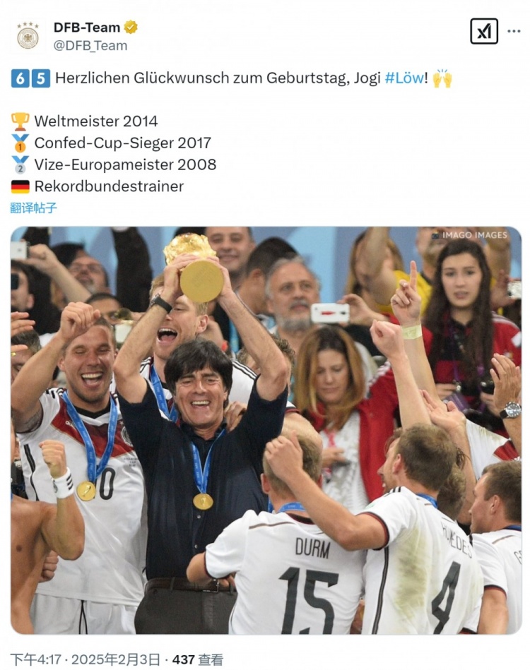 2月3日訊 今天是前德國隊主帥勒夫的65歲生日,德國隊官方為他送上祝福。