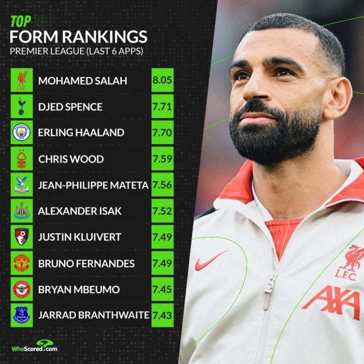 2月26日訊 whoscored統(tǒng)計了近6輪英超球員場均評分情況,薩拉赫力壓斯賓塞居首。
