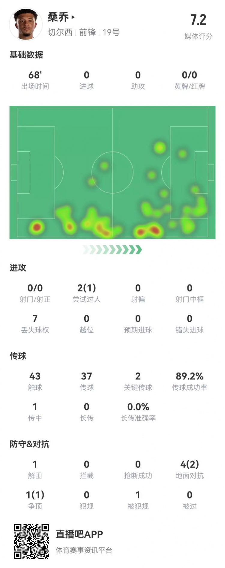 2月26日訊 切爾西在本輪英超3-0領(lǐng)先南安普頓,桑喬本場(chǎng)數(shù)據(jù)如下: