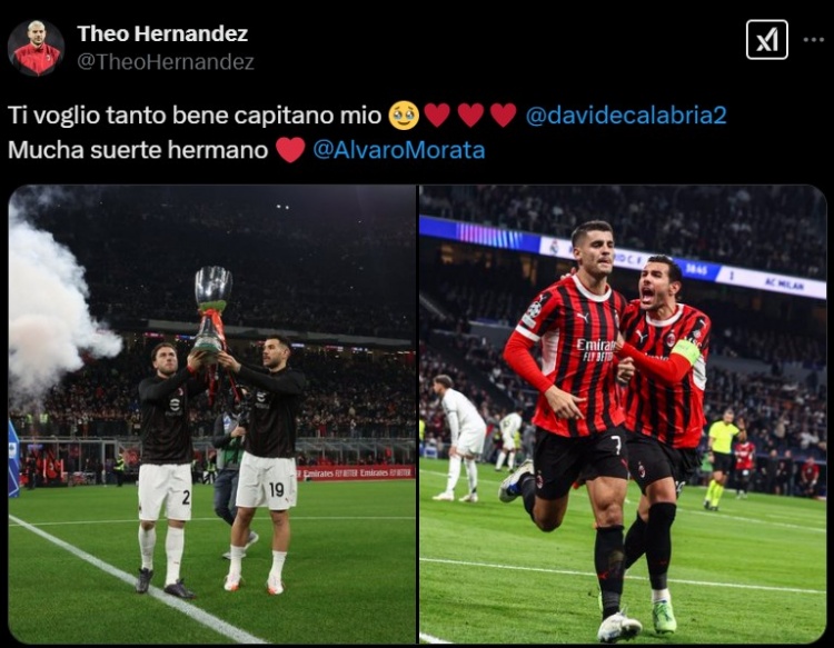特奧社媒配文寫道:“我是如此愛你,我的隊長卡拉布里亞,也祝我的兄弟莫拉塔未來好運!”